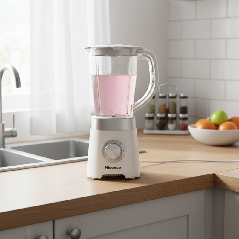 Blender HISENSE - Puissance: 500 Watts - Capacité: 1.5 Litres - Lame en acier inoxydable - Bol en plastique - Facile à utiliser avec plusieurs fonctions - Lame amovible pour un nettoyage facile - Design élégant - Couleur: Blanc et Inox - Garantie: 1 an