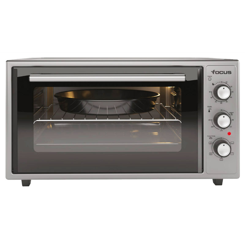 Four Électrique Focus - Puissance: 2000 Watts - Volume: 45 Litres - Température: Réglable jusqu'à 250°C - Minuterie: 90 min - Chaleur tournante - 6 Fonctions - Fonction Yaourt - Cavité Emaillée - Thermostat capillaire - Alimentation: 220-240V/50-60hz - 1 x Grill - 1 x Plateau rectangulaire - 1 x Plateau Rond - Dimensions: L x H x P: 50.5 x 32.45 x 37.96 cm - Couleur: Inox - Garantie: 1an