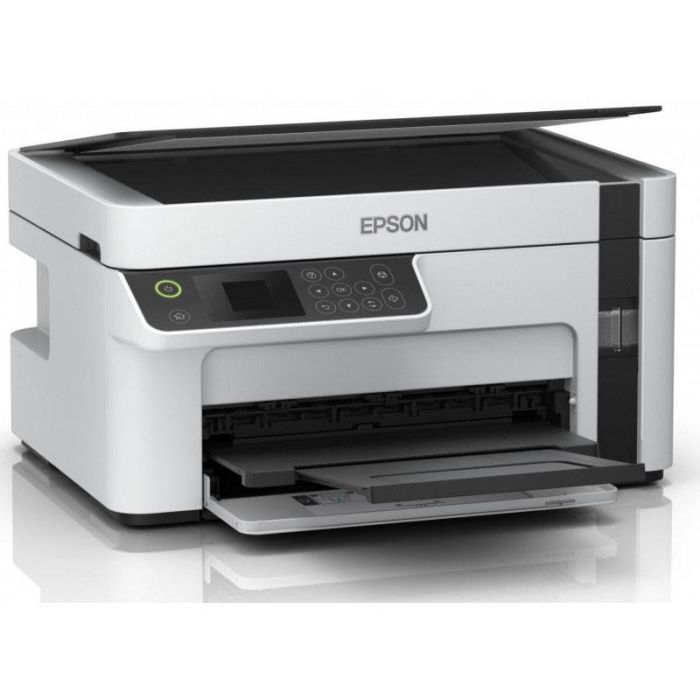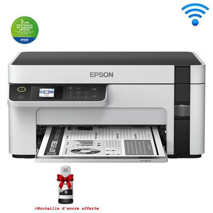 Imprimante Jet d'encre EPSON ECOTANK ET-M2120 Multifonction 3en1 Monochrome - Fonctions: Impression, Numérisation et Copie - Format Papier: A4 - Technologie d'impression: jet d'encre - Vitesse d'impression ISO: Jusqu'à 15 ppm (N&B) - Vitesse d'impression: 32 pages / min monochrome (papier ordinaire) - Résolution d'impression: 1.440 x 720 DPI (ppp) - Résolution de la numérisation: 1200 x 2400 DPI - Connectivité: USB, Wi-Fi, Wi-Fi Direct - Dimensions: 375 x 318 x 200 mm - Poids: 5 kg - Garantie: 1 an.