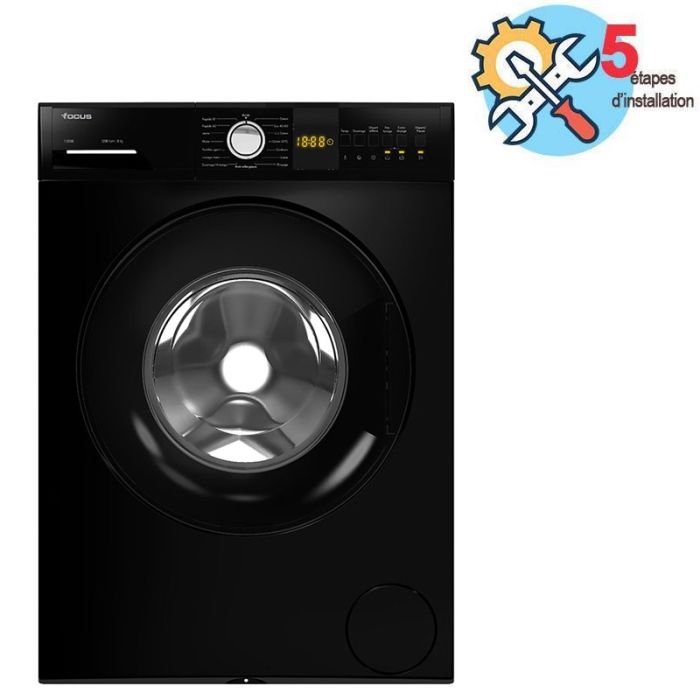 Lave Linge Frontal FOCUS - Capacité: 8 kg - Vitesse d'Essorage: 1200 tours/min - Classe Énergétique: A+++ - 15 programmes - Départ différé de 1 à 23 heures - Tambour en inox - Dimensions: H x L x P: 84.5 x 59.7 x 52.7 cm - Couleur: Noir - Garantie: 2 ans