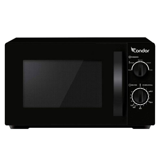 Micro-Onde CONDOR - Puissance: 700 Watts - Volume: 20 litres - Fonction décongélation - Minuterie Mécanique - Plateau en verre diamètre 270 mm - Alimentation électrique: 230V~50Hz - Dimensions: 48.5 x 29.25 x 37 cm - Couleur: Noir - Garantie: 1 an