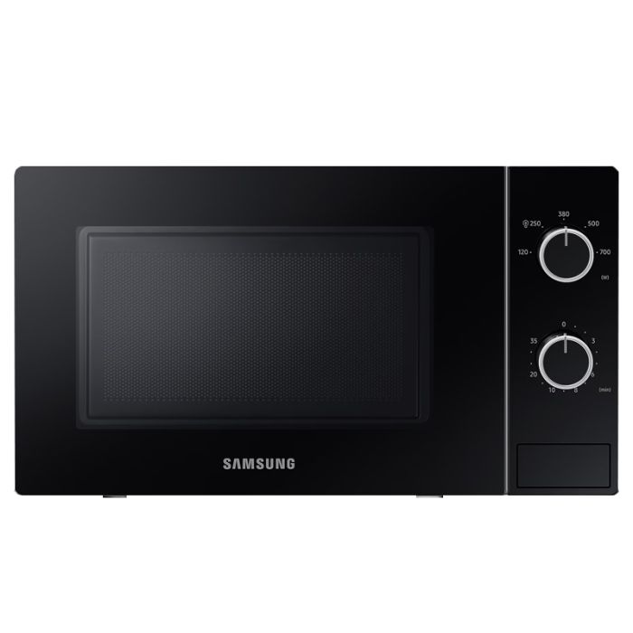 Micro-Onde SAMSUNG SOLO - Volume: 20 Litres - Puissance: 700Watts - 5 Niveau d'énergie - Minuterie de cuisson: 35 minutes - Alimentation: 230-240V/50Hz - Type de contrôle: Mécanique - Type de porte: Bouton poussoir - Taille du plateau: 255 mm - Porte entièrement vitrée - Dimension : 440 × 259 × 337,5 mm - Couleur: Noir - Garantie: 1an