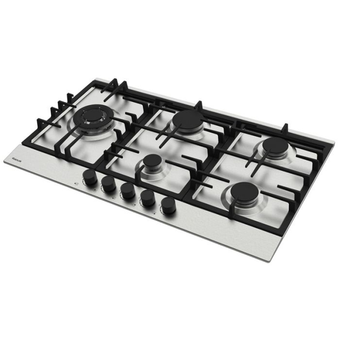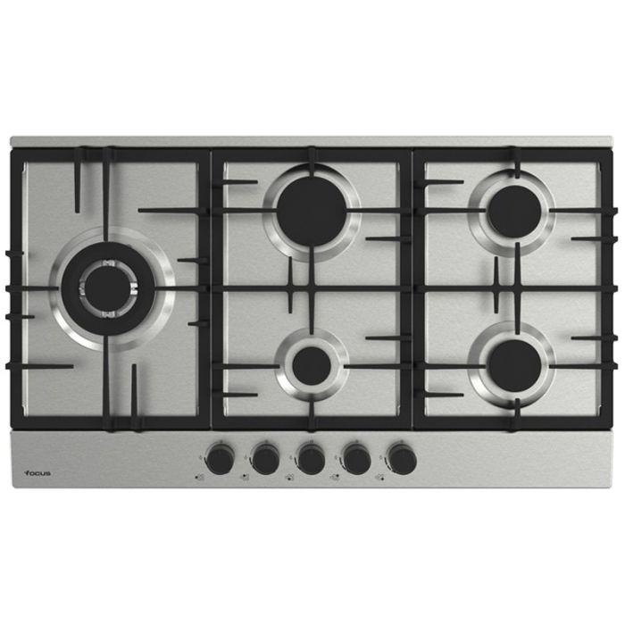 Plaque de Cuisson Encastrable FOCUS - Largeur: 90 cm - Nombre de Feux: 5 Feux l’un Triple Couronnes - Type de Plaque: à Gaz - Grilles et chapeaux de brûleurs en fonte - Flamme stabilisée - Commandes frontales - Allumage Automatique - Couleur: Inox - Garantie: 2 ans