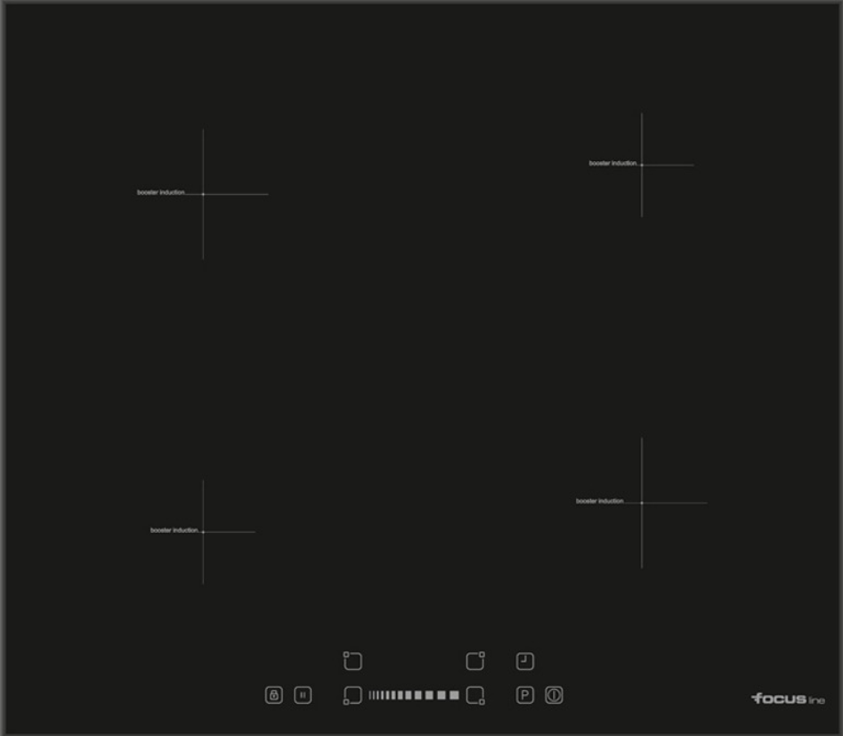 Plaque De Cuisson Encastrable FOCUS Line - Type de Plaque: Électrique - Largeur: 60 cm - Nombre de Foyers: 4 Foyers - Vitro induction - Contrôles sensitifs - Sécurité enfant - Indicateurs de chaleur - Dimensions: H x L x P: 50 x 590 x 520 mm - Couleur: Noir - Garantie 2 ans