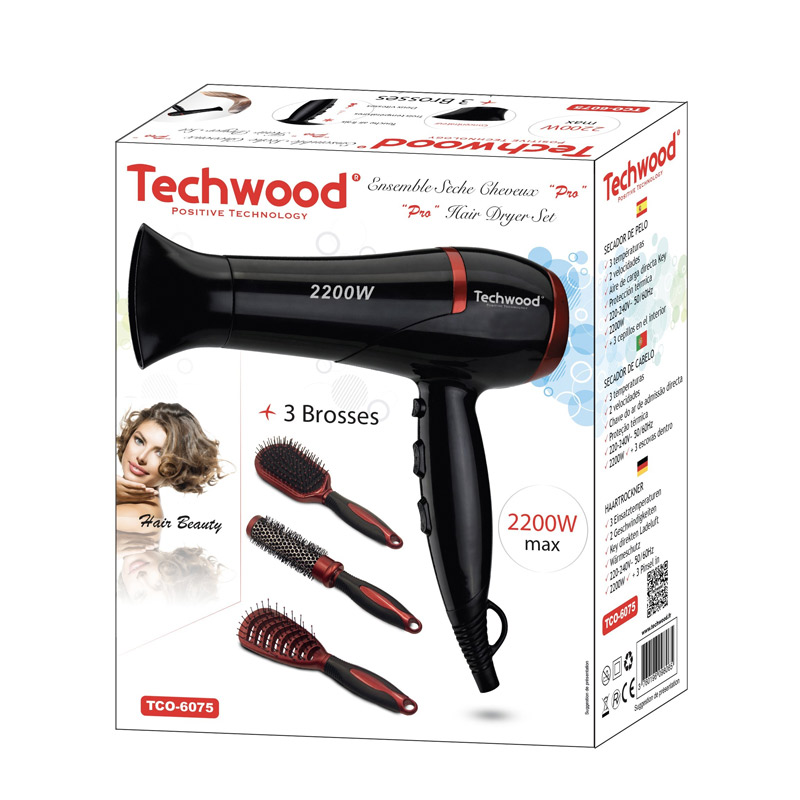 Sèche Cheveux Pro TECHWOOD - Puissance: 2200 Watts - Nombres de vitesses: 2 vitesses - Nombre de températures: 3 températures - Touche air frais direct - Protection thermique - Alimentation 220-240V~ 50/60Hz - 3 Brosses à l’intérieur - Couleur: Noir - Garantie: 1 an