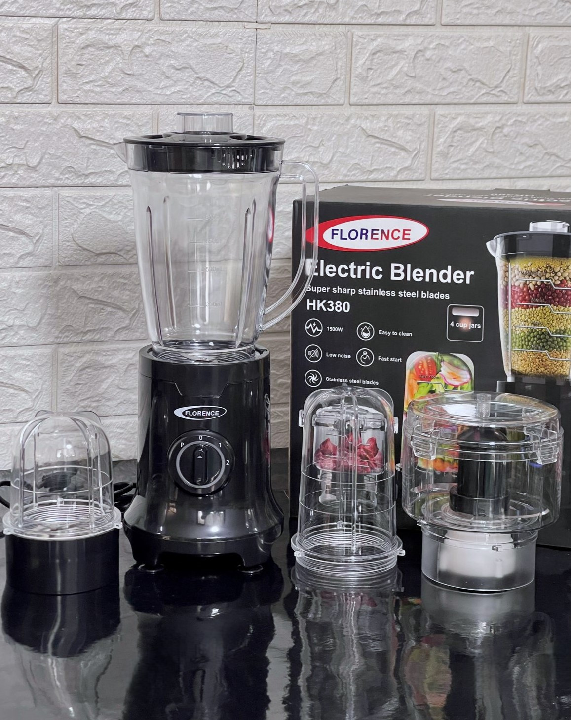 Blender 4EN1 FLORENCE - Puissance: 1500 Watts - Capacité Blender: 800ml - Capacité hachoir: 400ml - Capacité Smoothie: 400ml - Capacité Moulin: 200ml - Nombre de vitesse: 2 Vitesses + fonction impulsion - Lames en acier inoxydable - Bol en plastique - Pieds antidérapants - Alimentation: 220-240 V - Facile à nettoyer - Couleur: Noir - Garantie: 1an
