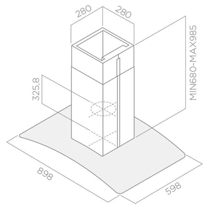 Hotte Centrale FOCUS - Largeur: 90 cm - 3 vitesses - Classe énergétique: A+ - Débit d'air: 850 m³/h - Eclairage: 2 Spots Halogène x 20W - Filtre aluminium lavable - Diamètre évacuation : 150 mm - Boutons - Couleur: Inox & Vitre - Garantie: 2 ans