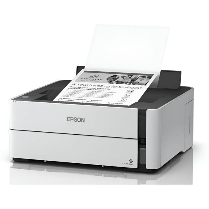 Imprimante EPSON ECOTANK M1170 - Technolgie d'impression: Jet d'encre (Tête d’impression PrecisionCore™) - Fonction: impression - Format Papier: A4 - Vitesse d’impression: 20 pages/min (ISO/IEC 24734), 39 pages/min (papier ordinaire) - Résolution d'impression: 1.200 x 2.400 DPI (ppp) - Impression recto/verso: Automatique - Connectivité: USB, Ethernet, Wi-Fi, Wi-Fi Direct - Dimensions: 375 x 347 x 151 mm - Garantie: 1 an