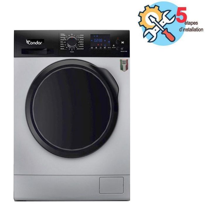 Lave linge Frontal CONDOR - Capacité de lavage: 9 Kg - Vitesse d’essorage: 1200 tours/min - Classe énergétique: A++ - 15 Programmes - Avec afficheur - Couleur: Silver - Garantie: 2 ans