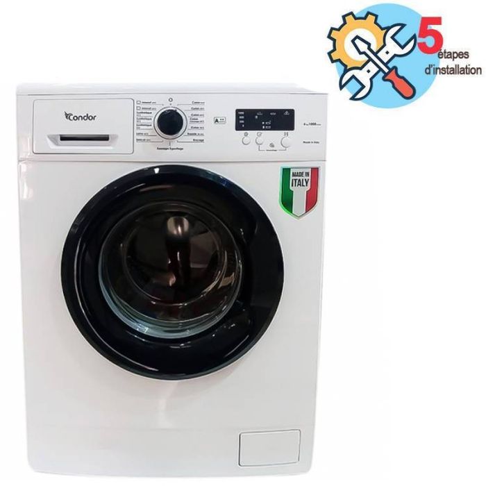 Lave linge Frontal CONDOR - Capacité de lavage: 7 Kg - Vitesse d’essorage: 1000 tours/min - Classe énergétique: A++ - 15 Programmes - Couleur: Blanc - Garantie: 2 ans
