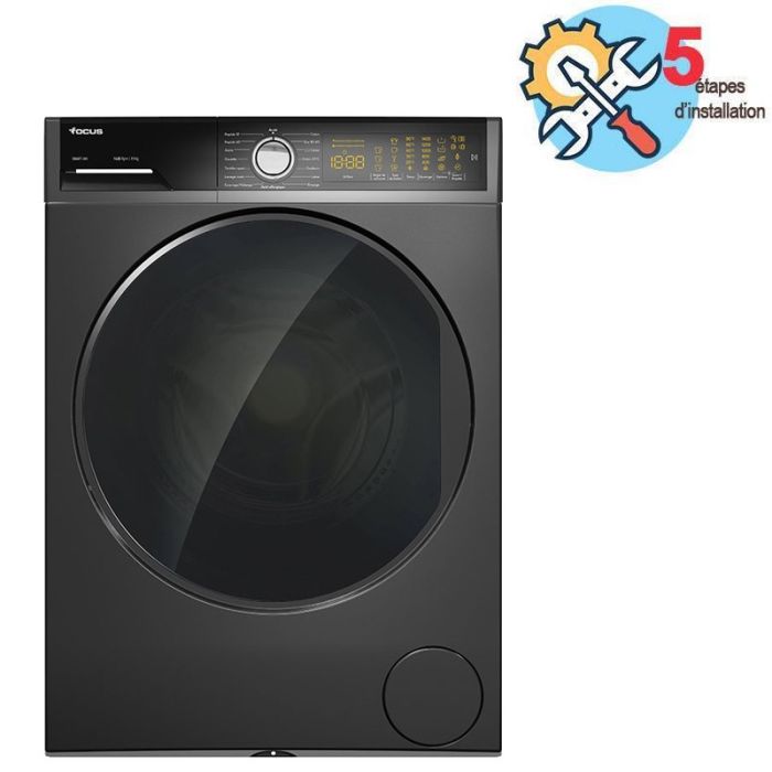 Lave Linge Frontal FOCUS - Capacité: 11 kg - Vitesse d'Essorage: 1400 tours/min - Classe Énergétique: A+++ - 15 programmes - Départ différé de 1 à 23 heures - Tambour en inox - Dimensions: H x L x P: 84.5 x 59.7 x 63.2 cm - Couleur: Gris Foncé - Garantie: 2 ans