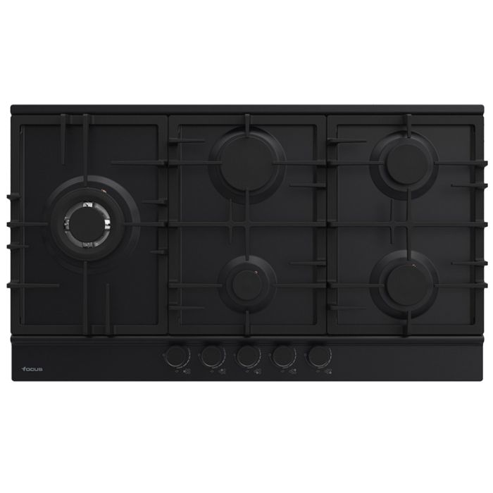 Plaque de Cuisson Encastrable FOCUS - Largeur: 90 cm - Nombre de Feux: 5 Feux - Type de Plaque: à Gaz - Grilles et chapeaux de brûleurs en fonte - Thermocouple - Flamme stabilisée - Sécurité gaz sur chaque brûleur - Commandes frontales - Allumage Automatique - Couleur: Noir - Garantie: 2 ans
