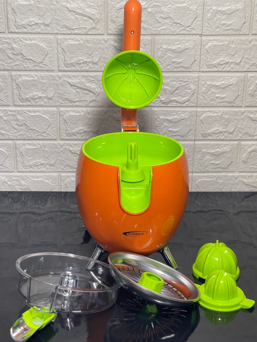 Presse Agrumes FLORENCE – Puissance: 450 Watts – Système anti-goutte – Distribution Direct Antidérapants – Accessoires détachables pour une utilisation et un nettoyage facile – Corps en plastique – Filtre en acier inoxydable – 2 cônes – Couleur: Orange – Garantie: 1an