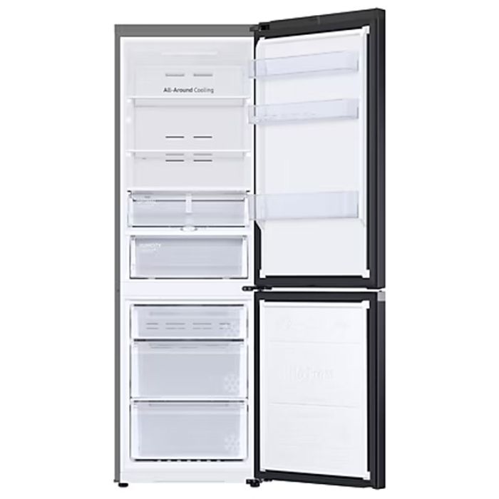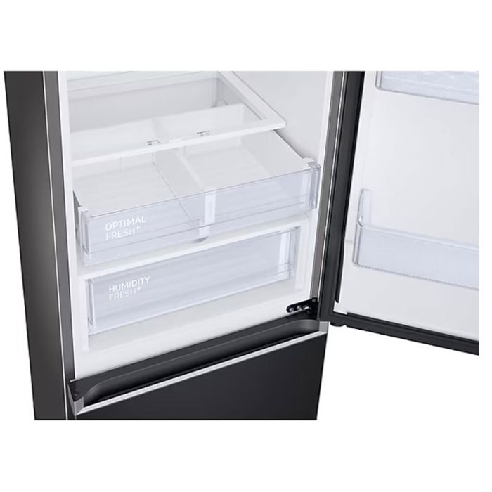 Réfrigérateur Combiné SAMSUNG - Système de refroidissement: NoFrost - 2 Portes - Froid ventilé - Volume Brut: 355 Litres - Volume Net: 340 Litres - Volume Net Du Réfrigérateur: 228 Litres - Volume Net Du Congélateur: 112 Litres - Classe Énergétique: A+ - Niveau Sonore: 37 dBA - Eclairage intérieur LED - Avec Afficheur - Wifi intégré - Consommation D’énergie: 300 kWh - R600a - Support de l'application SmartThings - Poignée Encastré - Fonction Power Freeze - Alarme sonore porte ouverte - Porte réversible - 3x clayettes en Verre trempé - 3x logement de porte - Casier à œufs - 2x Tiroirs fruits & légumes - 3x bacs Congélateur - Dimension: H x L x P : 1853 x 595 x 658 mm - Couleur: Noir - Garantie: 2 ans + 20 ans sur moteur