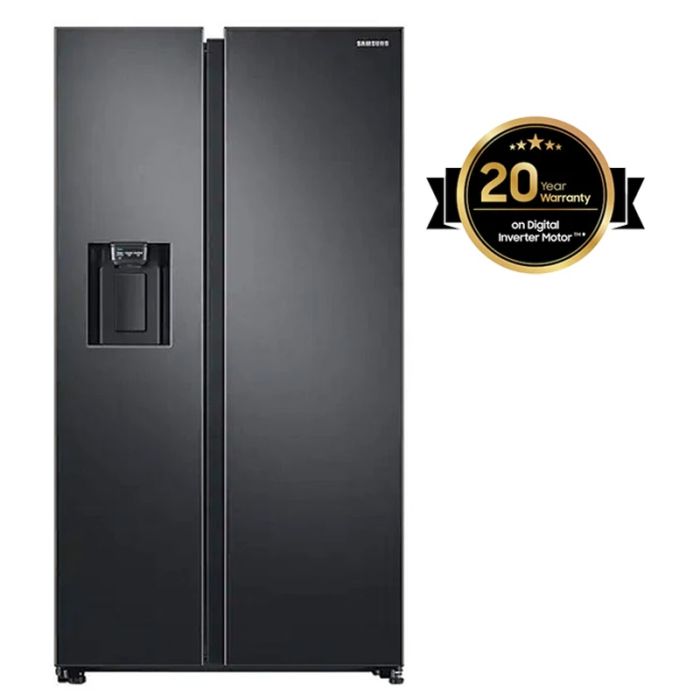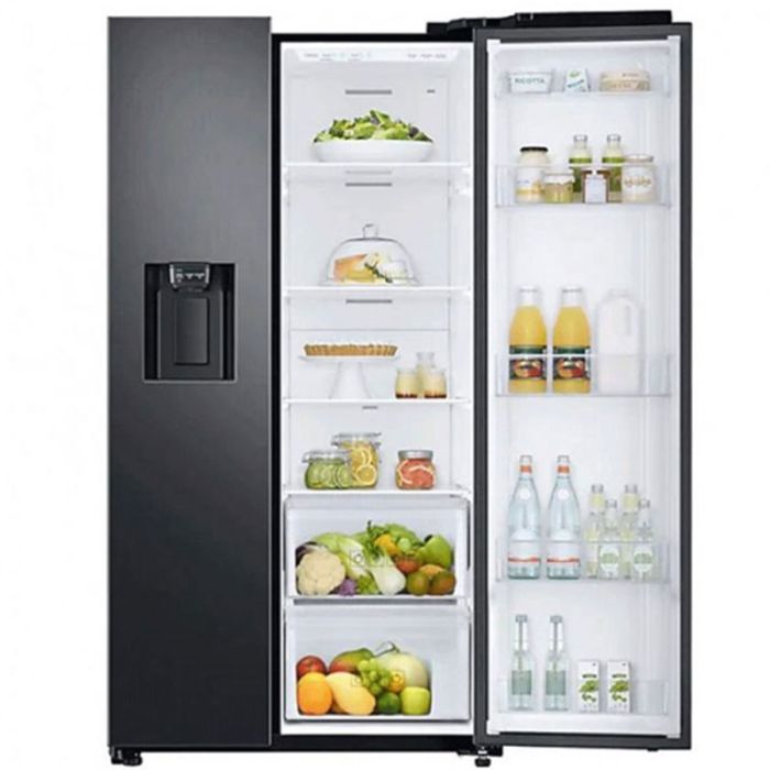 Réfrigérateur Side By Side SAMSUNG - 2 Portes - Système de refroidissement: NoFrost - Volume Brut total: 652 Litres - Capacité brute de Congélateur: 237 Litres - Capacité brute de réfrigérateur: 415 Litres - Volume Net total: 609 Litres - Capacité brute de Congélateur: 207 Litres - Capacité brute de réfrigérateur: 402 Litres - Classe Energétique: A++ - Consommation énergétique par an: 419 kWh / an - Niveau sonore: 38 dBA - Éclairage intérieur LED - R600a - Avec distributeur d'eau et Glaçon - Power Cool - Multi-Flow - Twin Cooling - Alarme sonore porte ouverte - 4 x Clayettes - 2 x Tiroirs Fruits & Légumes - 5 x Logement De Porte - Dimension: H x L x P: 178 x 91.2 x 71.6 cm - Poids: 113 kg - Couleur: Noir - Garantie: 2 ans + 20 ans sur moteur